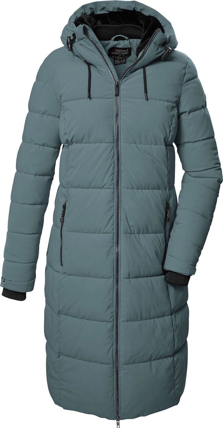 Der lange Damen Wintermantel in Daunenoptik begleitet zuverlässig durch die kältere Jahreszeit. Der Mantel ist winddicht und wasserabweisend mit einer 10.000 mm Wassersäule. Gleichzeitig ist er atmungsaktiv mit einer Wasserdampfdurchlässigkeit von 3.000 g/m²/24 h. Die weich gefütterte Kapuze lässt sich regulieren und schützt vor Kälte und Wind. Der 2-Wege-Reißverschluss ist mit einem praktischen Kinnschutz versehen. An den verstellbaren Ärmelabschlüssen befinden sich bequeme Strickbündchen. Zwei seitliche Zipper-Taschen sowie eine Innentasche bieten ausreichend Stauraum für alle wichtigen Dinge. killtec liegt es besonders am Herzen, die Kollektionen nachhaltiger und zukunftsfähiger zu machen. So setzt killtec verstärkt auf verantwortungsbewusstere Herstellungsverfahren. Dieser Wintermantel wurde daher mit fluorfreien Mitteln imprägniert und wurde teilweise aus recyceltem Material hergestellt.